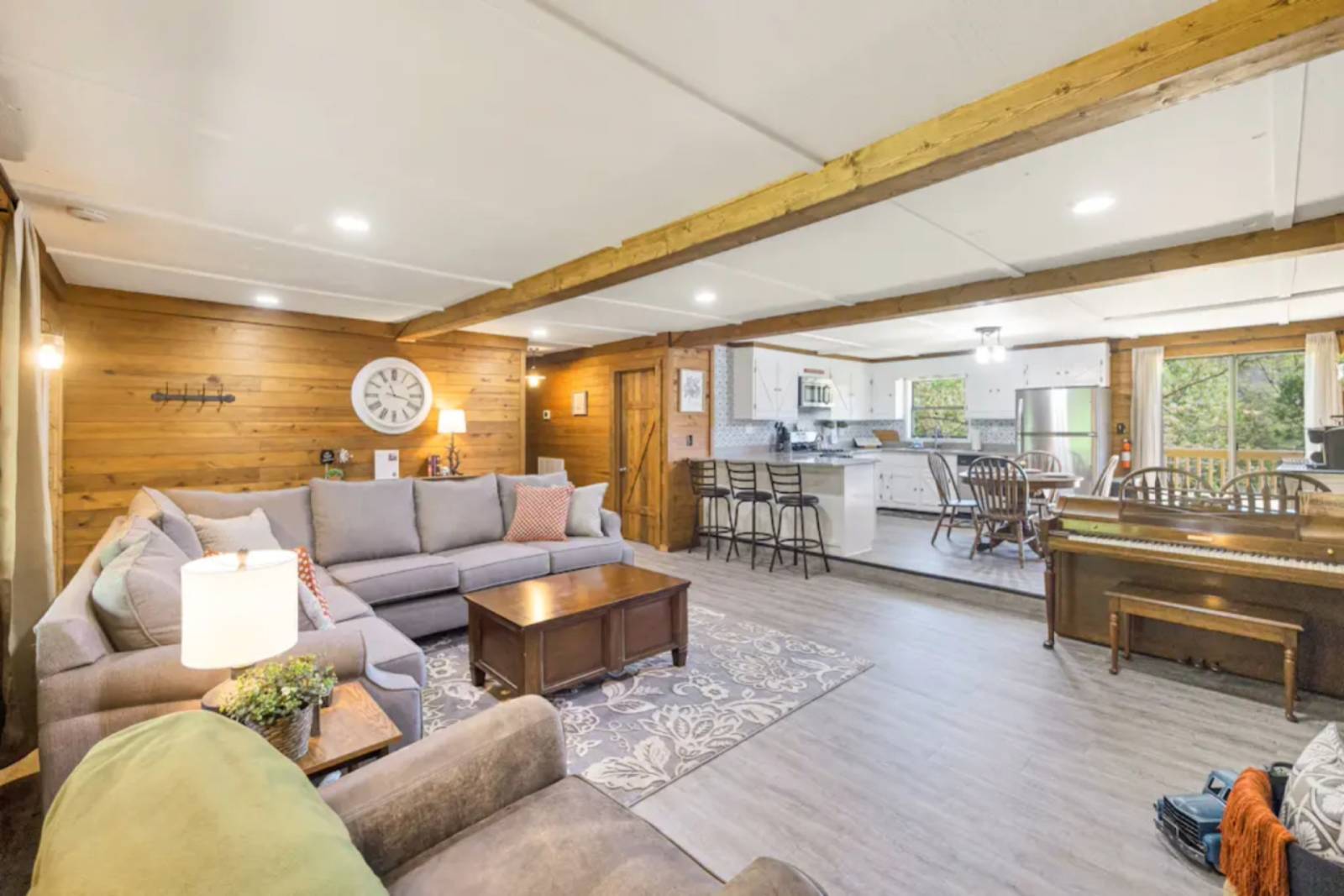 This cabin offers comfortable sleeping arrangements for up to 6 guests, across 4 bedrooms. The primary bedroom has an ensuite bath, while an additional full bath is shared on the main floor. The 4th bedroom, privately located in the back corner of the cabin, has an ensuite 1/2 bath as well. On-site washer and dryer provided as well. Enjoy the fully stocked kitchen with stove, oven, refrigerator, dishwasher, and other appliances to make meals a breeze – including a Keurig, toaster, blender, crockpot, waffle maker, and an array of pots and pans.